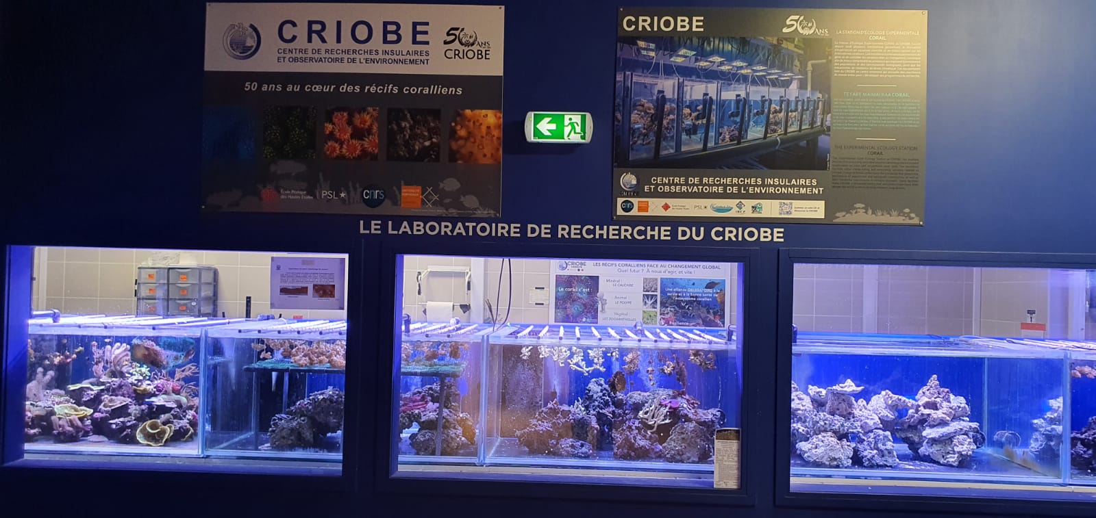 Fenêtre sur le laboratoire de recherche du CRIOBE, nurserie, pépinière de coraux, récifs artificiels.