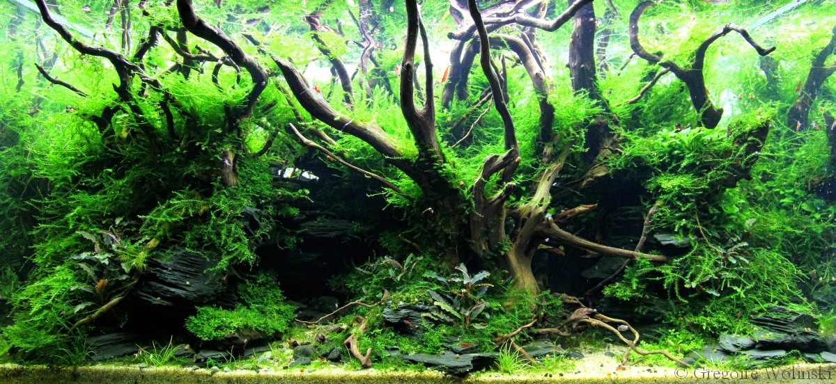 Cet aquarium représente un paysage de forêt. Il est composé d’un arrangement de bois, de pierres et de plantes. Parallélisme sylvestre obligeant, les mousses y ont généralement une place prépondérante !